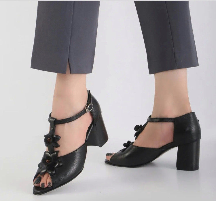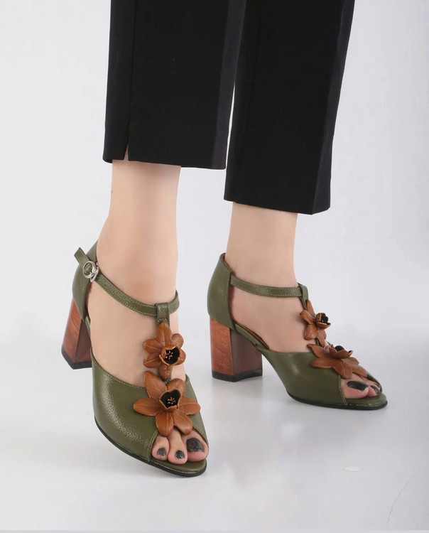این کفش زیبا با رویه تمام چرم طبیعی و پاشنه چوبی سبک، انتخابی عالی برای روزهای گرم سال است. طراحی گلدار روی چرم، ظاهری خاص و زنانه به آن بخشیده و رنگبندی جذاب سبز، مشکی و سرمهای امکان ست کردن با انواع استایلهای تابستانی را فراهم میکند.