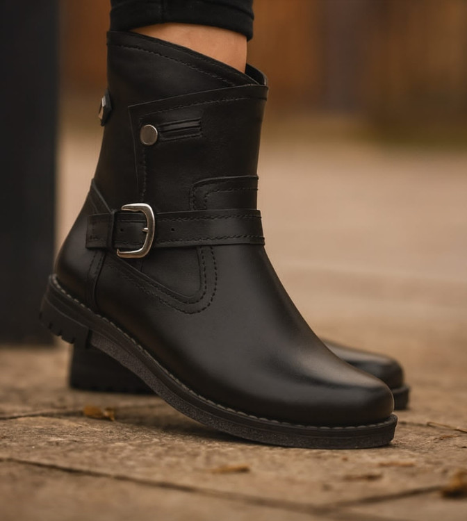 با این نیم بوت مشکی شیک و بادوام، استایل پاییزی خود را کامل کنید و از ترکیب زیبایی و راحتی در هر قدم لذت ببرید.