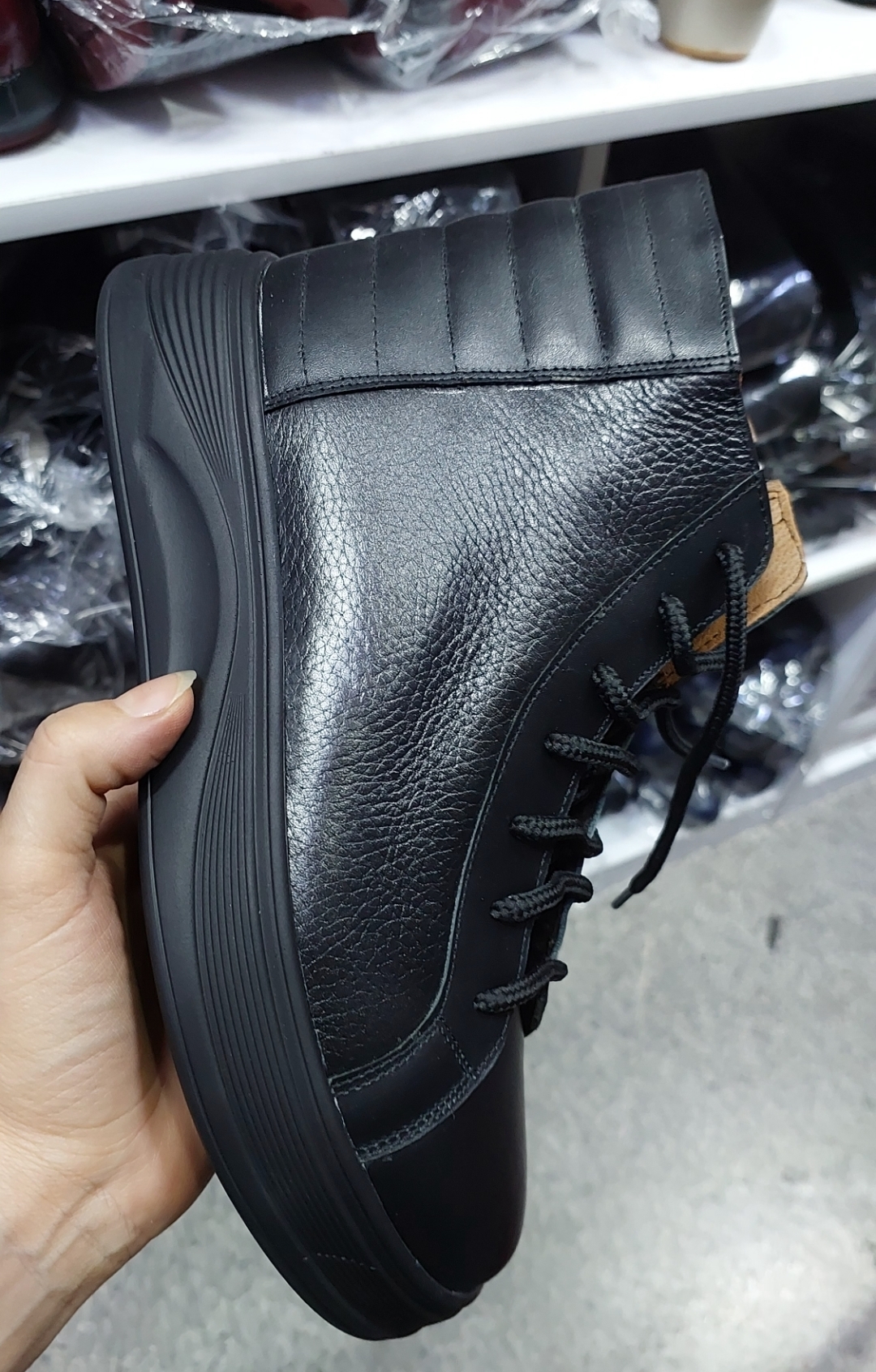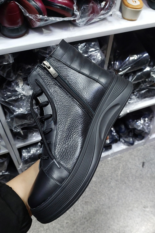 رویه این نیم بوت از چرم با بافت طبیعی ساخته شده که علاوه بر ظاهر شیک، مقاومت بالایی در برابر چروک و خطوخش دارد. طراحی بندی کلاسیک در کنار یقه بالشتکی (قسمت بالای ساق) باعث فیکس شدن بهتر پا و افزایش راحتی هنگام راه رفتن میشود. رنگ مشکی مات آن، انتخابی هوشمندانه برای ست شدن با انواع مانتو، پالتو و شلوار جین است.
